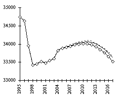 Количественные результаты прогнозных расчетов показывают, что численность экономически активного населения в прогнозный период будет уменьшаться, в первую очередь за счет сокращения численности экономически активных женщин (рис. 2, 3). Численность занятого населения уменьшится к концу прогнозного периода на 3,5-5% в зависимости от сценария. Динамика занятости по полу заметно различается. Численность занятых мужчин растет до 2011 г., а к концу прогнозного периода уменьшается на 0,5-1%. Сокращение численности занятых женщин начнется уже с 2007 г. и к 2017 г. составит 6-8%. Численность безработных сокращается в соответствии со всеми сценариями. По прогнозу, к 2010 г. она составит две трети текущей своей величины. Численность безработных женщин сокращается значительно интенсивнее, и в зависимости от сценария к гг. достигает нулевых значений. В совокупности с рассмотренным ранее прогнозом занятости такой результат позволяет говорить о перспективном дефиците женской рабочей силы. Мужская безработица сохраняется еще до гг.