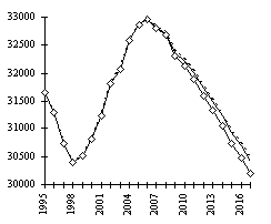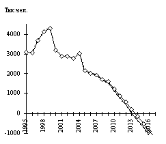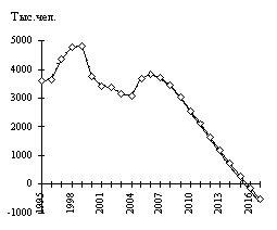 Как видно из данных таблицы 3, с 1990 г. доминирует фактор движения, т. е. изменение численности работников обоих полов происходит в этот период почти исключительно за счет совместного движения потенциальных работников и вакантных рабочих мест. Иначе говоря, социально-экономические факторы довлеют над демографическими. Только с 1996 г. демографический фактор вновь становится значимым: в гг. его вклад в прирост потенциальных работников составил от 25 до 50%. В дальнейшем ежегодный прирост численности потенциальных работников вследствие действия данного фактора составлял не менее 500 тыс. чел. Наиболее существенно влияние демографического фактора отражалось на численности потенциальных работников-женщин.