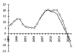 Параметры e01, e02 приняты равными отношению прироста трудоспособного населения соответствующего пола к численности потенциальных работников. Параметры μ1, μ2 равны отношению прироста занятых в экономике (соответственно мужчин и женщин), взятого с обратным знаком, к произведению численности потенциальных работников и вакантных рабочих мест. Если |m2| > |m1|, то это означает, что в ситуации экономического спада характерно большее несовпадение вакансий и потенциальных работников-женщин, т. е. у женщины меньше шансов найти работу. В период подъема это, напротив, свидетельствует о большей мобильности женщин на рынке труда и лучшем использовании ими возможностей экономики по расширению занятости. Разные знаки при коэффициентах m1, m2 говорят о различной реакции на отдельных сегментах рынка труда на экономическую ситуацию. Наконец, e1, характеризующий изменение числа вакантных рабочих мест (спрос на рабочую силу), находится как отношение суммы прироста вакантных рабочих мест и прироста численности занятых в экономике к общему числу вакансий.