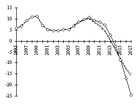 Оценка перспективной динамики других параметров представляется более сложной задачей. Например, прогноз параметра e1 предполагает перспективную оценку тенденций изменения спроса экономики на рабочую силу и динамики вакансий. На уровне народного хозяйства в целом большая часть тенденций изменения спроса экономики на рабочую силу отражается динамикой ВВП. Оценка соответствующей регрессии показывает, что до 75% изменений моделируемого параметра может быть объяснено изменениями динамики ВВП. Влияние фактора инвестиций на изменение моделируемого параметра неустойчиво, поэтому в прогнозных расчетах он не учитывался. Предварительный корреляционный анализ показал, что динамику параметров m1 и m2 можно объяснить изменениями двух показателей: параметра e1 и номинальной заработной платы.