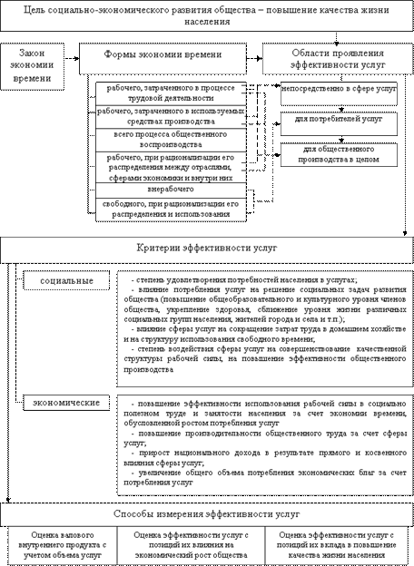 - обоснован методологический подход к исследованию эффективности услуг, базирующийся на законе экономии времени, в рамках которого выделены формы экономии времени и области проявления эффективности услуг, сформулированы социальные и экономические критерии эффективности и конкретизированы способы измерения эффективности услуг;