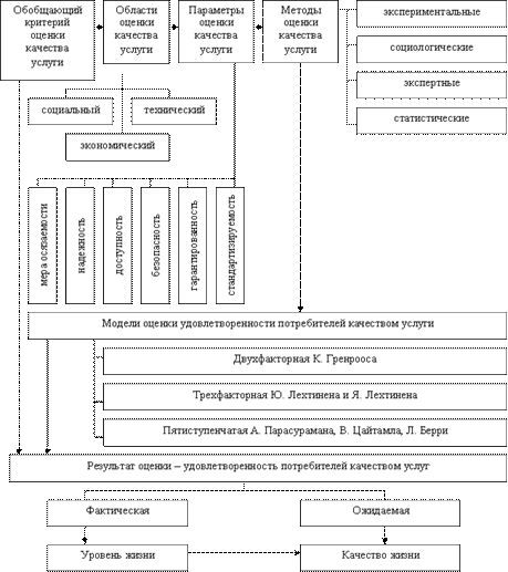 - обоснована методология исследования качества услуг как критерия качества жизни потребителей, в основу которой положена взаимосвязь обобщающего критерия и результата оценки качества услуги (удовлетворенности потребителей); с учетом социального, экономического и технического аспектов качества услуги конкретизированы параметры и методы его оценки, соответствующие базовым моделям оценки удовлетворенности потребителей качеством услуги;