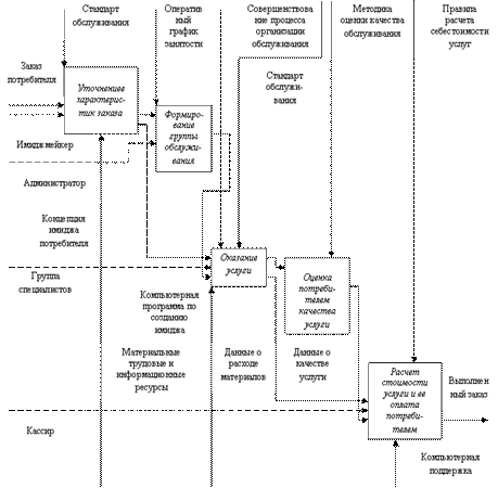 - предложена модель совершенствования процесса организации обслуживания потребителей услуг, в рамках которой, исходя из факторов организации обслуживания, уточнены схема элементов процесса и требования к реализации модели; осуществлена детализация процесса обслуживания потребителей услуг на основе методологии IDEF(0) в целях формирования информационной основы для разработки рекомендаций по его совершенствованию;