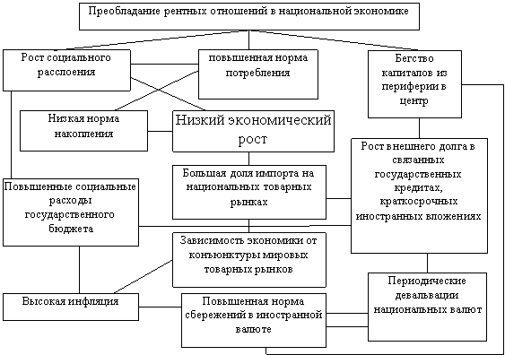 Естественным и прямым следствием распространения рентных отношений является высокая норма потребления, поскольку доходы, приобретенные в краткосрочных схемах, граничащих с незаконными, для инвестирования не предназначены по определению.