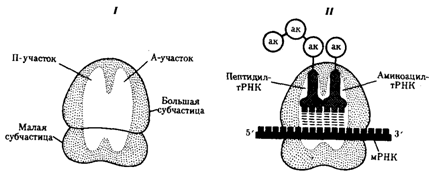 В рибосомах имеется две бороздки. Одна из них удерживает растущую полипептидную цепь, другая — мРНК. Кроме того, в рибосомах выделяют два участка, связывающих тРНК. В аминоацильном, А-участке размещается аминоацил-тРНК, несущая определенную аминокислоту. В пептидильном, П-участке располагается обычно тРНК, которая нагружена цепочкой аминокислот, соединенных пептидными связями. Образование А- и П-участков обеспечивается обеими субчастицами рибосомы.