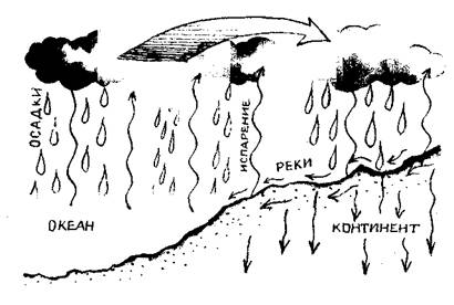 Другая часть дождевой воды просачивается в породы, слагающие поверхность земной коры, и уже далее движется в ее недрах. На рис. 10 показаны главные пути круговорота воды в природе. Это, конечно, только схема. Она не может показать того, в действительности, сложного пути, который проходит вода в своем стремлении к вечному круговороту.