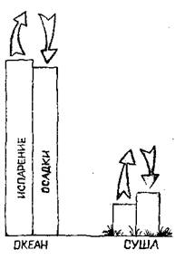Конечно, более всего воды циркулирует над океаном. На рис. 11 показана диаграмма, сопоставляющая осадки и испарение воды над океаном и сушей.