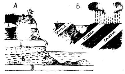 А — вот так появляются второй и третий слои подземных вод; Б — вода находит путь в глубокие слои по наклонным пластам, выходящим на земную поверхность