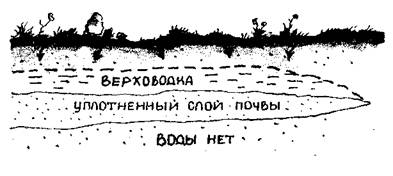 Бывают совершенно неожиданные случаи. Например, в долине Дона нами было встречено подобное «озеро» над старинной казачьей лодкой «Чайкой», когда-то захороненной песками реки. Его размеры были в длину 8 м, а в ширину около 3 м. Слой воды был около 1 м. Эти мелкие маловодные горизонты воды в сухое время года могут исчезать, испаряясь и инфильт-руясь в глубь толщи. Так их и назвали — «верховодка». Он часто путает неумелых искателей воды. Вырыли колодец, встретили верховодок, вода как будто есть, а вычерпали 5 — 10 ведер и далее ее нет.