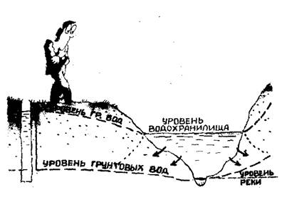 Специалисты говорят, что возникает явление подпора. Буквально на глазах уровень подземных вод начинает повышаться. До постройки водохранилища он находился на глубине 20 — 30 м и более. Проходит несколько лет и он может подняться до глубины 1 — 10 м. Таким образом, вокруг искусственного моря на некотором расстоянии от берега (от сотен до многих тысяч метров) возникает повсеместный подъем уровня подземных вод. Нередки и такие случаи, когда грунтовая вода достигает дневной поверхности или оказывается на небольшой глубине. В результате появляются болота или на отдельных участках развивается засоление почв. Эти процессы часто приносят ряд неприятностей: подтопление зданий, затопление карьеров, деформацию сооружений, возникающую в связи с тем, что прочность мокрого грунта меньше прочности сухого. Поэтому гидрогеолог должен заранее предвидеть, как изменится уровень грунтовых вод после постройки водохранилища.