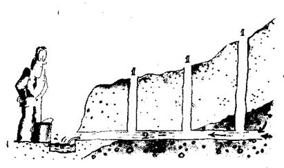 В странах Месопотамии и Средней Азии научились перехватывать подземные воды, протекающие по водоносным слоям, с помощью специальной системы подземных галерей-кяризов. Такие кяризы имеются и сейчас в районе Ашхабада (рис. 44).