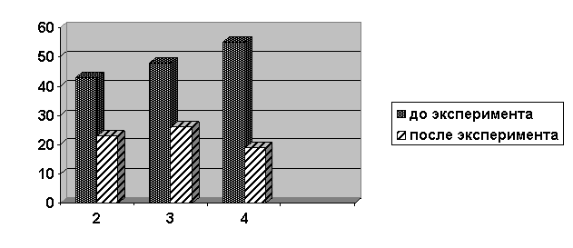 Рис. 3 Гистограмма, отражающая количество грамматических ошибок, допущенных учащимися экспериментального класса до и после эксперимента.
