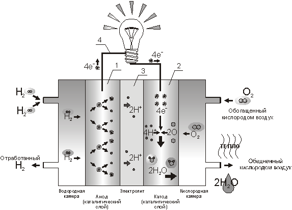 Напротив, на кислородном электроде (2, рис. 1) накапливаются протоны, и он заряжается положительно. Другими словами, между анодом и катодом возникает разность потенциалов (ЭДС). Поэтому при соединении анода и катода внешней электрической цепью (позиция 4, рис. 1) в ней течет электрический ток, который может совершать полезную работу (на рис. 1, как пример, показана горящая электрическая лампочка). Электроны, поступившие по электрической цепи на катод, делают возможной (с участием катализатора) реакцию образования воды из проникших через мембрану протонов и кислорода, подаваемого извне на катод: