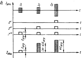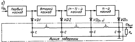 Возможны различные схемы, обеспечивающие получение логарифмической характеристики в УПЧ. Наиболее распространена схема логарифмического УПЧ с последовательным детектированием сигналов отдельных каскадов усиления и их суммированием (рис. 6 а, б). Суммарный сигнал выделяется на общей нагрузке Рн, с которой поступает на дифференцирующую цепь с малой постоянной времени, как в линейном УПЧ.