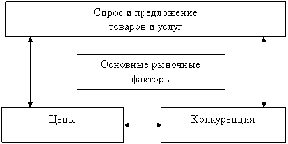 Рынок - это саморегулирующаяся система. Механизм рыночного саморегулирования включает три главных взаимосвязанных фактора: 1) рыночные цены; 2) спрос и предложение товаров и услуг; 3) конкуренцию (рис.1). Рыночные цены - это фактические цены, свободно складывающиеся на рынке в соответствии со спросом и предложением товаров.