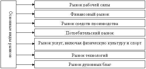 Рынок включает элементы, непосредственно связанные с обеспечением производства, а также элементы материального и денежного обращения. Он охватывает не только производство, но и непроизводственную сферу и даже сферу духовной жизни. Рынок услуг включает и такой их специфический вид, как физкультурно-спортивные услуги.