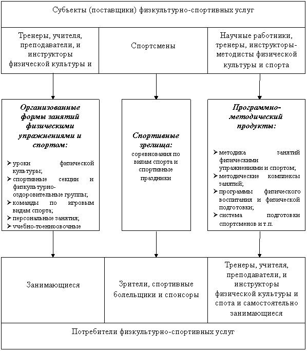 Поставщиками физкультурно-спортивных услуг являются тренеры, учителя, преподаватели, и инструкторы физической культуры и спорта спортсмены, тренеры, инструкторы-методисты физической культуры и спорта. Продуктами их деятельности являются организованные формы занятий физическими упражнениями и спортом; спортивные зрелища; программно-методические продукты.