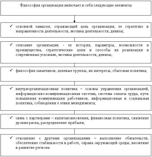 Концепция культуры и философии организации строится на основе ценностных ориентиров (экономических, политических, социальных, эстетических, этических и др.) и определенных типов предпочтительных целей к которым относятся: рост, прибыльность, процветание; стабильность, общий объем капитала и продаж; социальная ответственность относительно прибыльности, косвенная конкуренция, климат организации; этика и мораль (Рис.7.). На рисунке 8 представлены элементы философии организации.