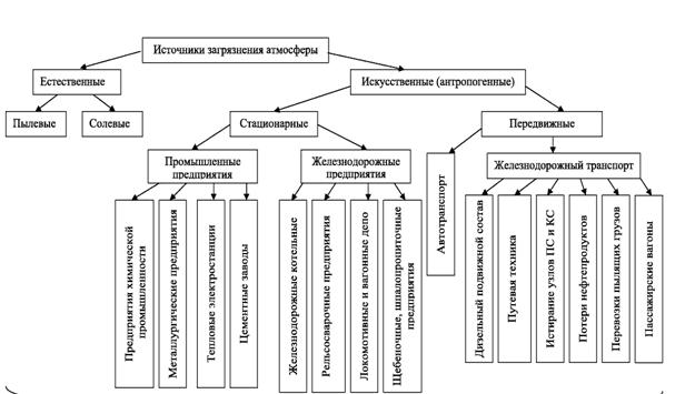 К природным источникам загрязнения атмосферы относятся пылевые, солевые и морские загрязнения. К искусственным (антропогенным) источникам загрязнения атмосферы относятся промышленные предприятия и транспортный комплекс. Высокая концентрация промышленного производства в отдельных районах земного шара и быстрое увеличение объемов сжигаемого топлива привели к выбросу в атмосферу значительных количеств тепла, углекислого газа, тяжелых металлов и их соединений и других загрязняющих веществ.