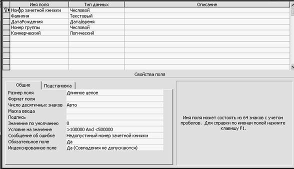 1. Установите диапазон возможных значений номеров зачетных книжек от 100001 до 499999. Для этого выделите поле Номер зачетной книжки и на вкладке Общие введите следующее выражение для свойства Условие на значение: >100000 And <500000. Для вывода сообщения об ошибке при вводе номера введите значение соответствующего свойства: Недопустимый номер зачетной книжки. Вид окна конструктора со свойствами поля Номер зачетной книжки представлен на рис. 1.