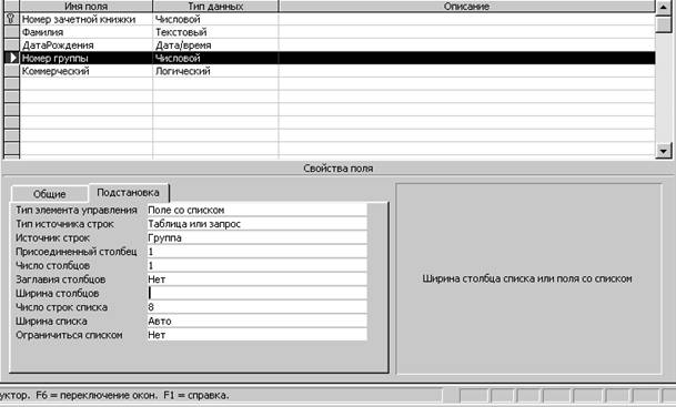 2. Для выбора номера группы из списка выделите поле Номер группы и откройте в нижней части бланка вкладку Подстановка. Щелчком мыши раскройте список в строке Тип элементов управления и выберите тип Поле со списком. Установите в строке Тип источника строк - Таблица или запрос. Выберите из списка для строки бланка Источник строк таблицу Группа. Вид окна конструктора со свойствами поля Номер группы представлен на рис. 2.