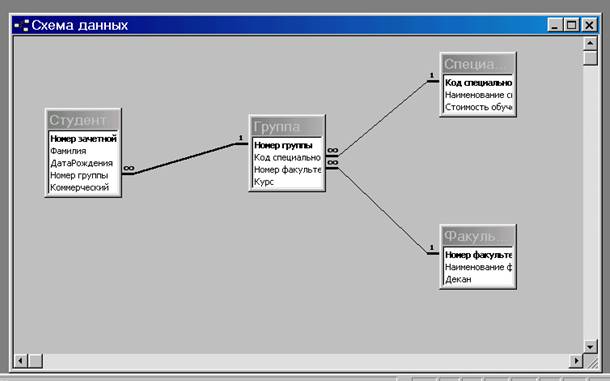 Схема данных (рис.3) связывает таблицы Студент, Группа, Специальность и Факультет. Между ними установлены следующие связи: