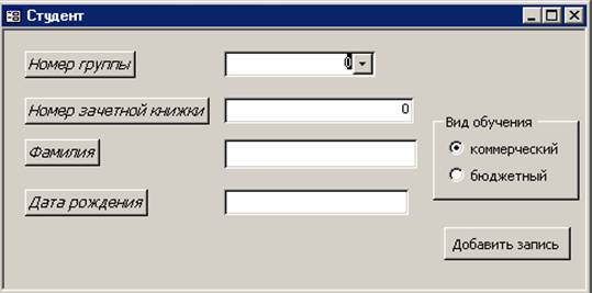 3. Создать форму «Студент» для ввода информации в таблицу 4. Номер группы выбирать из списка, содержащего сведения о наименовании факультета и наименовании специальности. Выбор вида обучения (коммерческий или бюджетный) производить с помощью переключателей. Предусмотреть контроль поля Номер зачетной книжки и выдачу сообщения в случае возникновения ошибки ввода. Ввести сведения о 25 студентах, обучающихся в 5 группах.
