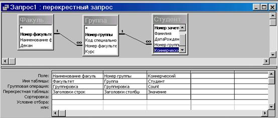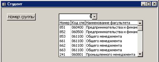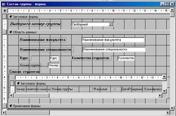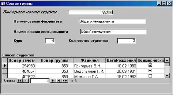 4. Создать форму (типа главная/подчиненная) «Состав группы» для просмотра списка коммерческих студентов, заданной группы. Главная форма должна содержать номер группы, наименование факультета, наименование специальности, номер курса и количество студентов в группе. Подчиненная должна содержать список студентов группы, содержащий полные сведения о каждом студенте. Номер группы выбирать из списка.