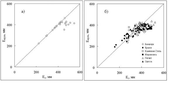 Используя приведенные выше зависимости выполнены расчеты средних многолетних величин суммарного испарении полей яровой пшеницы по материалам 26 агрометеорологических станций, для шести из которых (Безенчук, Ершов, Каменная Степь, Мироновка, Гигант и Одесса) проведены расчеты суммарного испарения за отдельные годы. Расчеты выполнены в двух вариантах: при отсутствии мульчирующего покрытия и при наличии слоя соломенной мульчи в 5 см.