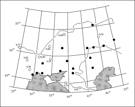На рис. 2 представлена карта пространственного распределения средних многолетних величин отношений