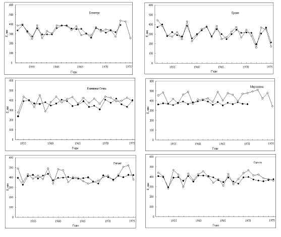 Представление о том, как за отдельные годы соотносятся величины суммарного испарения при традиционной агротехнике и при мульчировании почвы дают хронологические графики, показанные на рис. 3. На них можно проследить, что в отдельные годы мульчирование приводит к снижению суммарного испарения, а в последующие накопленная в почве вода может привести к его увеличению (за счет увеличения транспирации). Это характерно, в основном, для засушливых станций Безенчук и Ершов. В Каменной Степи и Мироновке в большей части случаев испарение при наличии мульчи заметно ниже. Наглядное представление об этом дает график, представленный на рис. 2-б. За исследуемый ряд лет максимальная величина уменьшения суммарного испарения при мульчировании составила от 53 мм (Безенчук) до 124 мм (Мироновка).