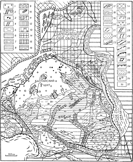 1-9 – Восточно-Европейская платформа: 1-3 – щиты: 1 – выходы фундамента на поверхность (местами прикрытого маломощным чехлом), 2 – грабены и впадины, выполненные верхне-протерозойскими и палеозойскими образованиями, 3 – верхнепротерозойские и палеозойские интрузивные массивы; 4-9 – Русская плита; 4 – погребенные грабены, выполненные верхним протерозоем и частично верхним палеозоем (авлакогены), 5 – крылья щитов, 6 – антеклизы и своды в сложных антеклизах, 7 – седловины, крылья антеклиз и межсводовые прогибы в смежных антеклизах, 8 – синеклизы и перикратонные впадины, 9 – наиболее глубокие части синеклиз с субокеаническим типом строения коры; 10-12 – рифтогенные зоны: 10 – выступы байкальского (или салаирского) складчатого основания, 11 – то же, каледонского и герцинского, 12 – участки, перекрытые платформенным чехлом; 13-16 – складчатые области без расчленения: 13 – выступы добайкальского фундамента, 14 – поднятия в чехле, 15 – впадины в чехле, 16 – наиболее глубокие части впадин с предположительно субокеаническим типом строения коры; 17-22 – подвижные складчатые пояса: 17 – выступы складчатого основания каледонид Северо-Атлантического пояса, 18 – то же, герцинид, частично более древних структур и ранних киммерид Урало-Монгольского и Средиземноморского поясов, 19 – герцинские и раннекиммерийские краевые прогибы, 20 – участки складчатых областей, перекрытые мезокайнозойским и частично более древним чехлом молодых плит и параплакосов, 21 – позднекиммерийские и альпийские складчатые области, 22 – альпийские краевые прогибы; 23-25 – океанические впадины: 23 – краевые зоны (континентальные ступени), 25 – глубоководные зоны с корой океанического типа. 24 – участки с утоненной корой континентального типа; отдельные структуры: 26 – мезокайнозойские плакантиклинали (валы), 27 – районы развития соляных диапиров, 28 – грабены позднепротерозойские и палеозойские, 29 – то же, мезозойские и кайнозойские, 30 – крупные крутые разломы на поверхности, 31 – то же, погребенные, 32 – крупные надвиги и тектонические покровы, 33 – тектонические окна, 34 – крупные флексуры в чехле, 35 – некоторые наложенные мезокайнозойские впадины в чехле Русской плиты, 36 – астроблемы установленные и предполагаемые, 37 – номера структурных элементов Восточно-Европейской платформы: 1. Впадины Балтийского щита. 2. Ботнический авлакоген. 3. Грабен Осло. 4. Грабен Ладожский. 5. Грабен Кандалакшский. 6. Украинский щит. 7. Палчелмский (Рязано-Саратовский) авлакоген. 8. Днепропетровско-Донецкий авлакоген. 9. Камско-Бельский авлакоген (Калтасинско-Осинский). 10. Крестовский или Валдайский авлакоген. 11. Солигаличский авлакоген или Рослатинский грабен. 12. Яренский авлакоген. 13. Оршанская впадина. 14. Волынская впадина. 15. Московский авлакоген. 16. Гжатский авлакоген. 17. Абдулинский авлакоген. 18. Кировский (Кажимский) авлакоген. 19. Доно-Медведицкий авлакоген. 20. Юго-Восточный склон Балтийского щита. 21. Прибалтийская синеклиза. 22. Латвийская седловина. 23. Московская синеклиза. 24. Воже-Лачский авлакоген. 25. Велико-Устюгская седловина. 26. Сухонский вал. 27. Окско-Цнинский вал. 28. Мезенская синеклиза. 29. Онежский грабен. 30. Керецко-Пинежский грабен. 31. Лешуконский грабен. 32. Нижнемезенский грабен. 33. Притиманский грабен. 34. Воронежская антеклиза. 35. Белорусская (Белорусско-Литовская, Белорусско-Мазурская) антеклиза. 36. Бобру