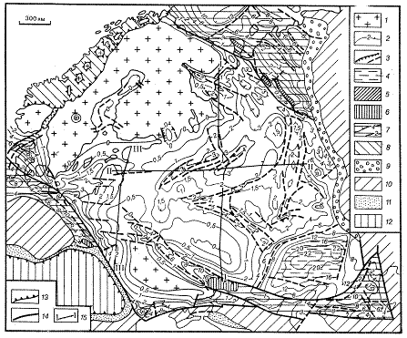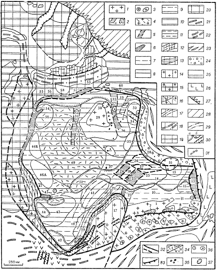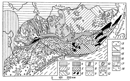 1-3 алданский комплекс нижнего архея, в основном слагающий Алданский мегаблок: 1 – иенгрская серия, слагающая Иенгрский блок (И), 2 – тимптонская и джелтулинская серии, слагающие Тимптоно-Учурский блок (Т), 3 – олекминская, чарская и другие серии, слагающие Олекминский (О), Чарский (Ч) и Батомгский (Б) блоки; 4 – курультино-гонамский и сутамский комплексы нижнего архея (или катархея?), в основном слагающие зону сочленения. Алданского и Станового мегаблоков – Зверевско-Сутамский блок (3); 5 – становой комплекс нижнего (?) архея, подвергшийся диафторезу в позднем архее – раннем протерозое, в основном слагающий Становой мегаблок (С); 6 – верхнеархейские – нижнепротерозойские массивы анортозитов, габброидов, пироксенитов; 7 – «троговый» терригенно-кремнисто-вулканогенный комплекс верхов архея – низов протерозоя, выполняющий узкие грабенообразные прогибы; 8 – удоканская терригенная серия нижнего протерозоя, выполняющая Кодаро-Удоканскую протоплатформенную впадину (К); 9 – Кодаро-Кеменский нижнепротерозойский лополит аллохтонных порфировидных гранитов; 10 – нижнепротерозойские автохтонные гранитоиды и гранито-гнейсы; 11 – улканская терригенно-вулканогенная серия верхов нижнего протерозоя, выполняющая Улканскую проторифтовую грабенообразную впадину (У); 12 – нижне-среднепалеозойские гранитоидные массивы; 13 – верхнемезозойские гранитоидные и сиенитовые массивы в Становом мегаблоке; 14 – крупные разломы, рассекающие фундамент щита; 15 – верхнепротерозойско-фанерозойский чехол Лено-Енисейской плиты Сибирской платформы; 16 – Байкальская складчатая область; 17 – Амуро-Охотская и Верхояно-Чукотская эпигеосинклинальные складчатые области; 18 – Охотско-Чукотский верхнемезозойский краевой вулканический пояс. Верхнепротерозойские и фанерозойские образования, за исключением крупных гранитоидных и сиенитовых интрузивных массивов, в пределах щита «сняты».