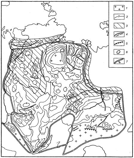 1 – выходы архейско-нижнепротерозойского фундамента; 2 – изолинии глубин залегания поверхности фундамента; 3 – районы, где эта поверхность лежит глубже -5 км; 4 – крутые разломы в фундаменте, смещающие чехол; 5 – то же, пологие (надвиги); 6 – астроблемы; 7 – границы Сибирской платформы и смежных складчатых областей