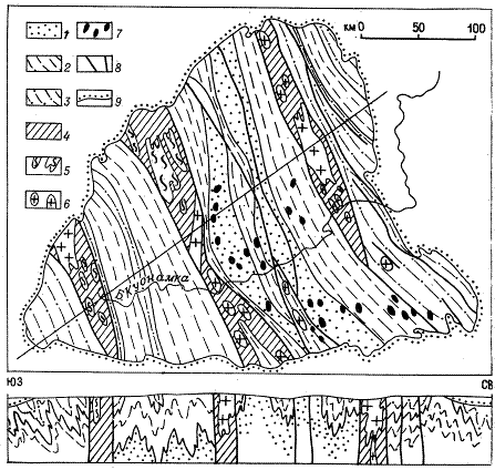 1-3 – анабарский комплекс (нижний архей): 1 – далдынская серия, 2 – верхне-анабарская серия, 3 – хапчанская серия; 4 – зоны милонитизации и катаклаза; 5 – анортозиты; 6 – граниты; 7 – метагипербазиты; 8 – главнейшие разломы; 9 – граница несогласного налегания рифейских платформенных отложений