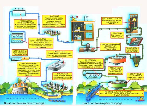 Сточные воды попадают в канализационный коллектор и при помощи мощных насосов подаются в систему очистки. На московских очистительных сооружениях применяются механическая и биологическая очистка вод и доочистка.