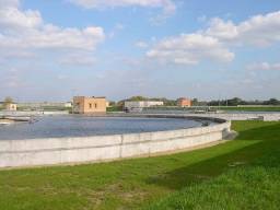 Образовавшийся в результате этих процессов хлопьеобразный осадок отделяют от воды во вторичных отстойниках. Отстойник представляет собой цилиндрический резервуар диаметром до 54 м, в центр которого попадает сточная вода. Вода движется от центра к периферии. В результате этого происходит осаждение осадка и вода осветляется.