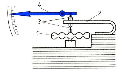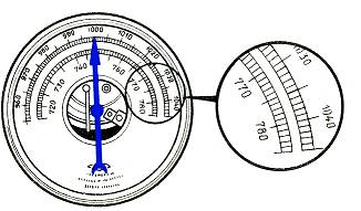 Чтобы атмосферное давление не раздавило коробку, ее крышку пружиной (2) оттягивают вверх. При увеличении атмосферного давления крышка прогибается вниз и натягивает пружину. При уменьшении давления пружина выпрямляет крышку. С помощью передаточного механизма (3) при изменении давления стрелка-указапередвигается вправо или влево. Под стрелкой укреплена шкала, деления которой нанесены в мм рт. ст. В системе интернациональной (СИ) единицей измерения давления является 1 Па. Нормальное атмосферное давление равно 101,3 кПа = 760 мм рт. ст. В зависимости от высоты над уровнем моря нормальное атмосферное давление может иметь различные значения. Чем больше высота, там давление меньше. Для Москвы в среднем нормальное атмосферное давление составляет 748 мм рт. ст.
