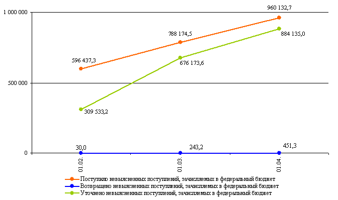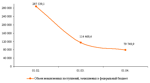 По состоянию на 1 апреля 2012 года уточнение невыясненных поступлений, зачисляемых в федеральный бюджет, составило 92,0% от общего объема их поступления.