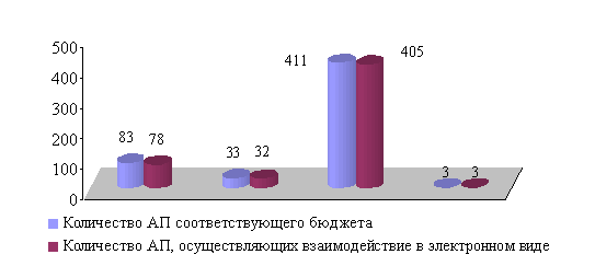 По состоянию на 1 апреля 2012 года к СЭД подключено 78 администраторов доходов федерального бюджета (94% от общего количества администраторов доходов федерального бюджета), 32 администратора доходов областного бюджета (97%), 405 администраторов доходов местных бюджетов (98%), 3 администратора доходов государственных внебюджетных фондов (100%) (диаграмма 4).