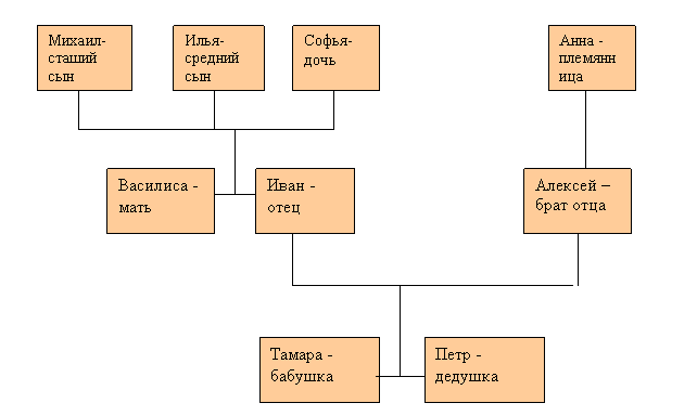 Как вы думаете, у людей, изображенных на рисунке, есть имена? (ответы). Мы не знаем как их звали, но мы можем придумать каждому из членов этой семьи имена, красивые, старинные, как в сказке.(дети предлагают, обсуждают и с учетом мнения выбирают имена.) Дедушка Петор, бабушка Тамара, отца назвали Иваном, мать - Василисой, дядю – Алексеем, сыновей –Михаилом, Ильей, Данилой, дочь – Софья, а маленькую племянницу – Аннушкой).