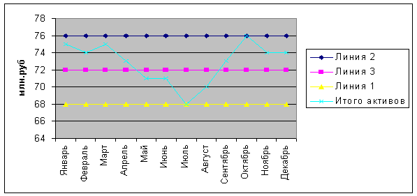 3. Линия 1 (при 68) характеризует агрессивную стратегию, при которой долгосрочные пассивы покрывают внеоборотные активы и системную часть текущих активов. В соответствии с этой стратегией предприятия его долгосрочные пассивы должны составить 68 млн. руб. (68-60).
