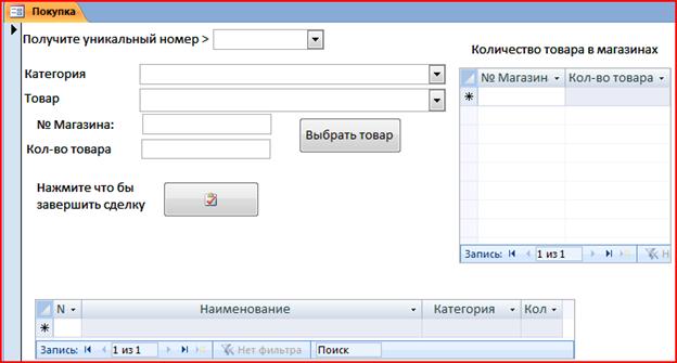 Если же проверка прошла успешно – то сначала запускается запрос на добавление новой записи в таблицу «Сделка». А поле него запрос на обновление записи в таблице «Товар в магазине». Оба запроса берут данные для добавления и обновления из полей формы. Затем следует простое обновление подчинённых форм.