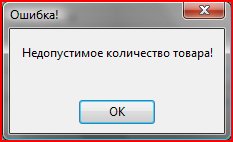 По первой микрокоманде проверяется условие, чтобы количество выбранного товара не превышало его количество в конкретном магазине. Если же это происходит, то выдаётся сообщение об ошибке (рис.2.7.) и макрос останавливается.