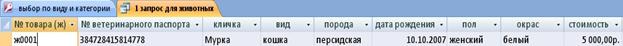 Рис. 2.10. Результат выполнения запроса, вид животного – кошка