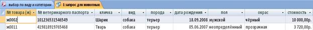 Рис. 2.11. Результат выполнения запроса, вид животного – собака