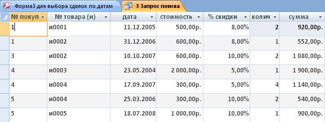 Between [Forms]![Форма3 для выбора сделок по датам]![ПолеСоСписком0] And Date() используются в конструкторе запроса в качестве условия отбора (рис.2.13).