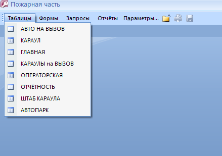 Рис. 2.24. Строковое меню БД «Пожарные части в округе г. Москвы»