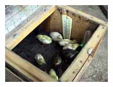 Ящики должны быть чистые, дно необходимо застелить чистой бумагой, которую необходимо менять по мере загрязнения. Хотя последние время я в своих брудерных ящиках вообще отказался от использования подстилки. Перепелят из инкубатора сразу же высаживаю в ящик, на дне которого находится сетка с ячейкой 5 х 10 мм. Это исключает появления и развития у перепелят так называемого "шпагата", когда ноги перепеленка начинают разъезжаться в разные стороны (сетка на дне дает этого сделать, являясь упором для ног).