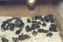 200 птенцов. Для обогрева и освещения используются 4 лампы мощностью 100 Вт в первые 3 дня и 60 Вт - до 10-го дня (заметим, что мощность и количество ламп может быть и иной, в зависимости от внешних условий). Если перепелятам холодно это легко определить. Они сбиваются в кучу ближе к лампе. В этом случае количество или мощность ламп нужно увеличить.